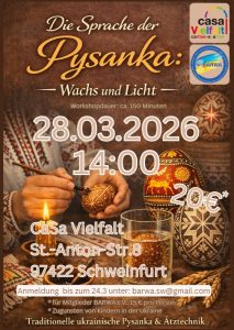 am 28.03. können Sie im Zentrum casa Vielfalt ein künstlerisches Handwerk kennenlernen und ausprobieren: ✨ Die Sprache der Pysanka: Wachs und Licht ✨ Workshop: Traditionelle