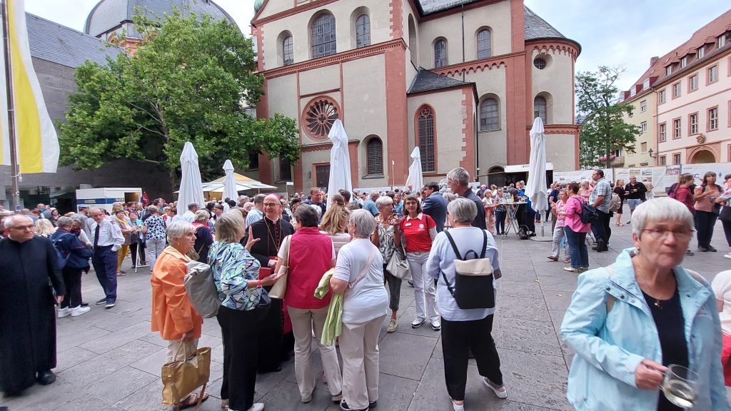 Nach dem Gottesdienst trafen sich alle zur Begegnung auf dem Kiliansplatz. Bei besten Wetter und guter Stimmung mischten sich neben dem Weihbischof auch Bischof Franz und Domkapitular Clemens Bieber unters Volk. Mit vielen schönen Eindrücken vom Gottesdienst und dem geselligen Beisammensein traten die Teilnehmenden aus der Region Schweinfurt ihre Heimreise an.