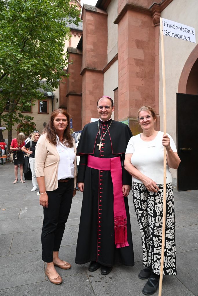 Nach dem Gottesdienst trafen sich alle zur Begegnung auf dem Kiliansplatz. Bei besten Wetter und guter Stimmung mischten sich neben dem Weihbischof auch Bischof Franz und Domkapitular Clemens Bieber unters Volk. Mit vielen schönen Eindrücken vom Gottesdienst und dem geselligen Beisammensein traten die Teilnehmenden aus der Region Schweinfurt ihre Heimreise an.