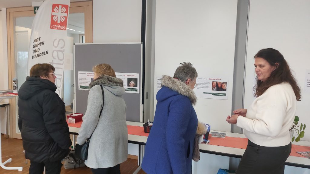 Anschließend gab es im Pfarrzentrum die Möglichkeit zu Begegnung, Austausch und Information. Unsere Mitarbeiterinnen im Fachdienst Gemeindecaritas, Susanne Gessner und Marion Hammer hatten, passend zum Motto, einen Infostand vorbereitet. Mit kleinen Impulsen wurden verschiedene Baustellen des Lebens aufgegriffen, mit einer Bibelstelle in Verbindung gebracht und über dazu passende Angebote und Beratungsdienste des Caritasverbandes für Stadt und Landkreis Schweinfurt informiert.