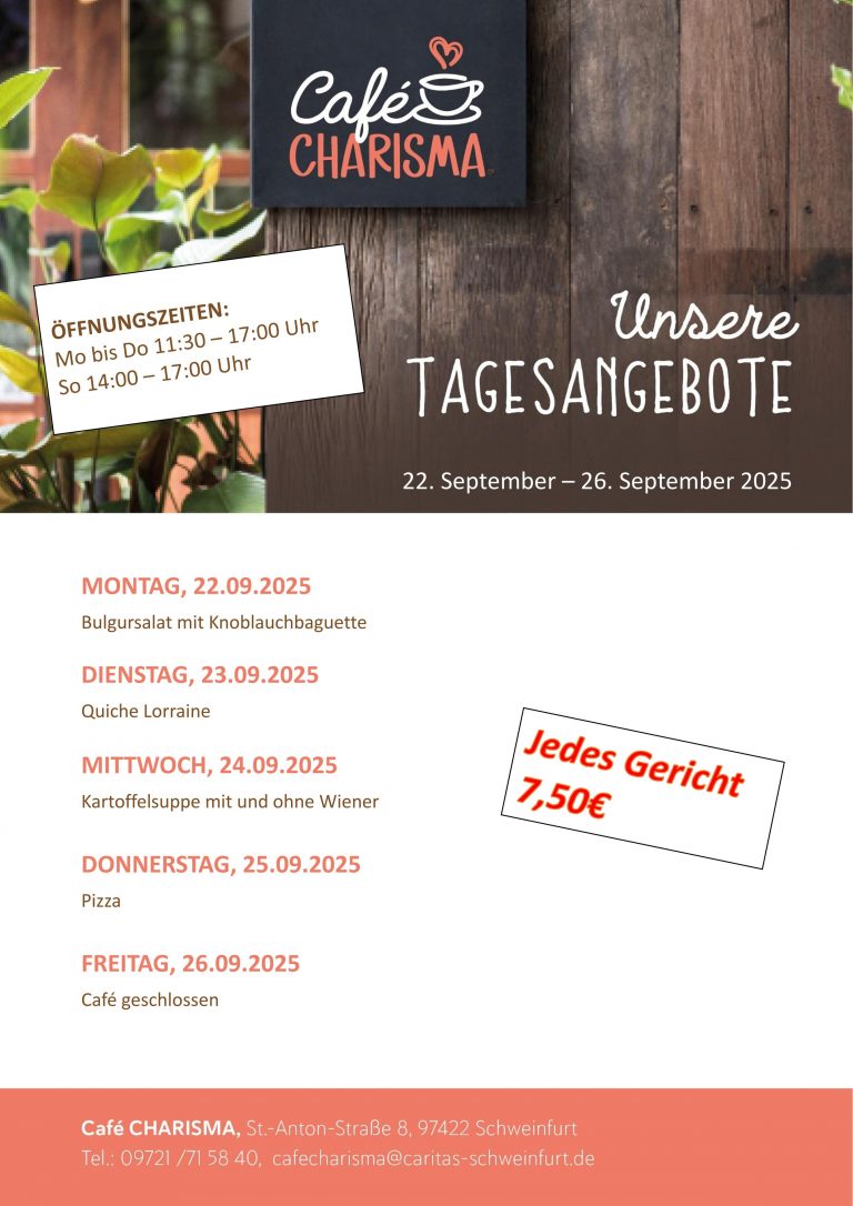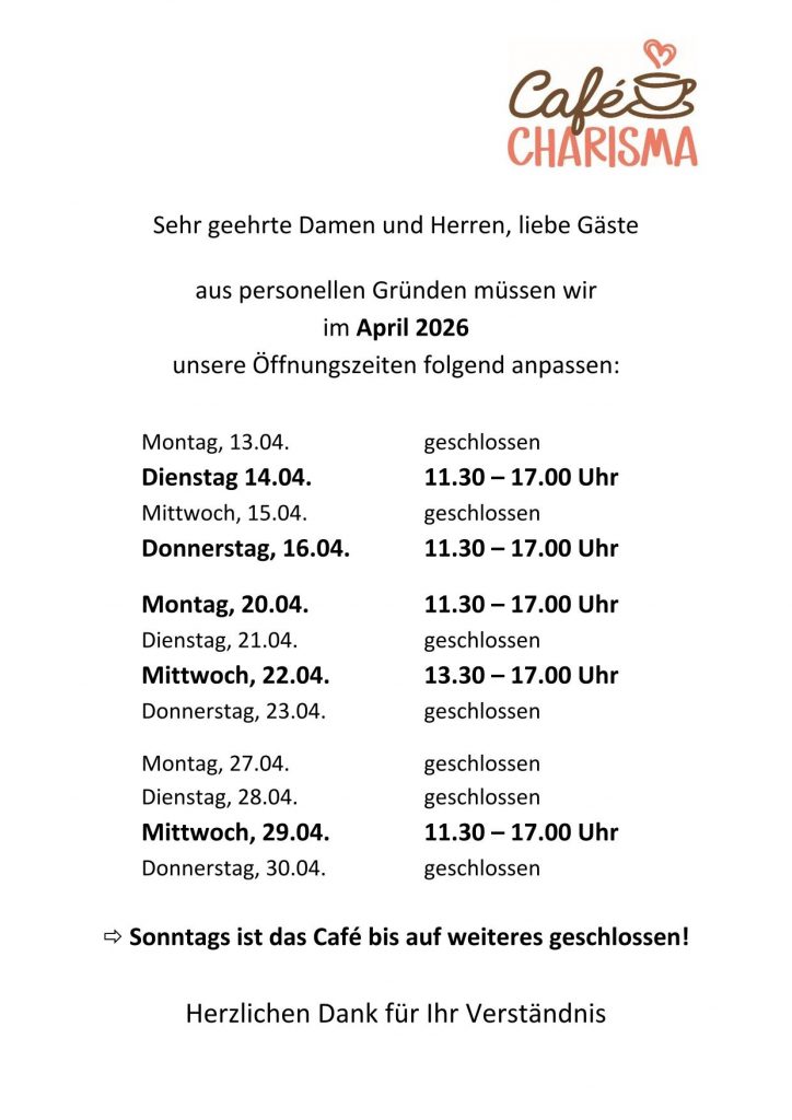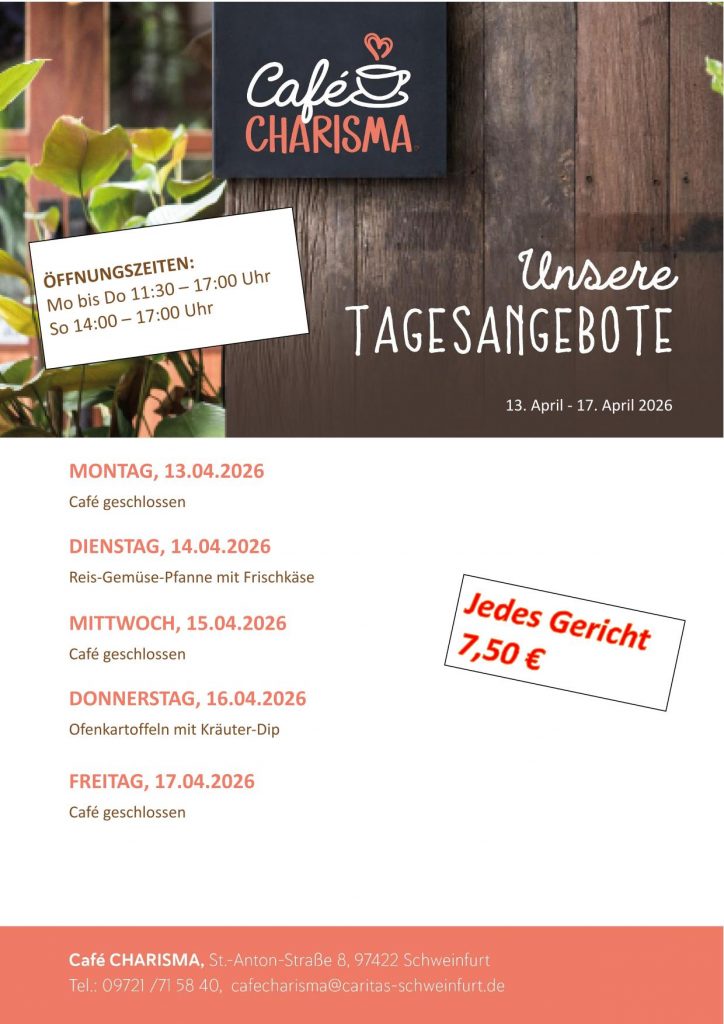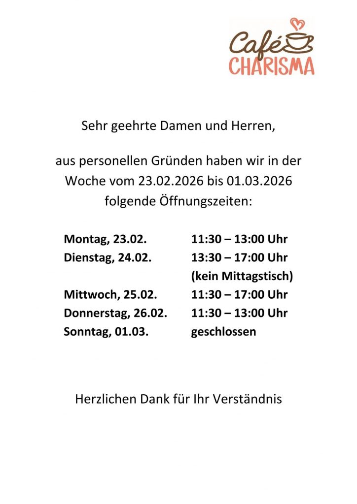 Das Café Charisma im „casa Vielfalt“ lädt Sie ein, bei einem Stück selbstgemachten Kuchen oder Torte und einer leckeren Tasse Kaffee zu verweilen oder auch einen kleinen Mittagsimbiss zu genießen. Das warme Ambiente der Räumlichkeiten und die schöne Terasse im Sommer sorgen für eine einladende Atmosphäre.