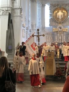 Im Mittelpunkt standen die vielfältigen Dienste der Caritas, denn „Gott hat keine anderen Hände als unsere. Durch uns kann deutlich werden, wie Gott ist“. Einen besonders anrührenden Moment mit spontanem Applaus gab es bei der Gabenprozession, als Bischof Franz Jung sichtlich bewegt einen übergroßen, verbundenen Teddybären in Empfang nahm, den eine Caritas Mitarbeiterin der Sozialstation zu den Worten “ als berufliche Mitarbeiterin spende ich Trost und setze mich in der Pflege für alte Menschen ein“ übergab.