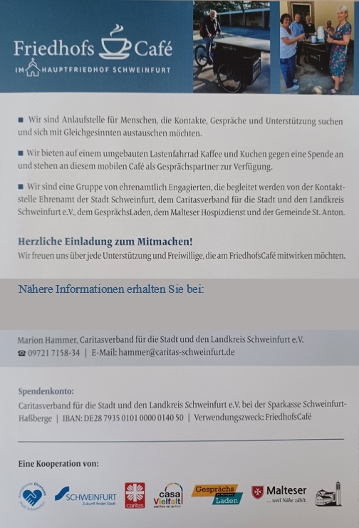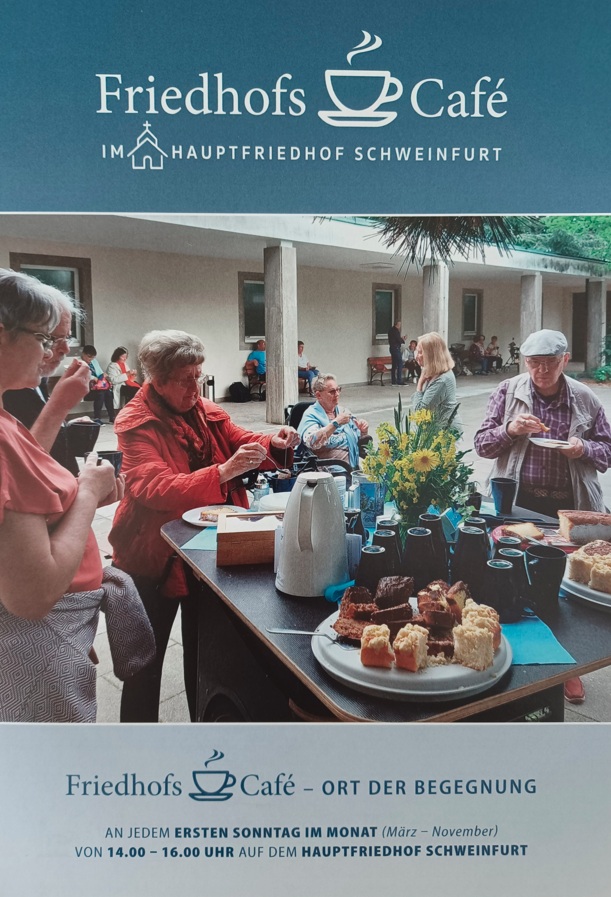 am 01. März startet wieder unser FriedhofsCafé auf dem Hauptfriedhof Schweinfurt. Ehrenamtliche Helferinnen und Helfer stehen für Gespräche zur Verfügung und verteilen gegen Spende Kaffee und Kuchen an die Gäste.