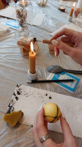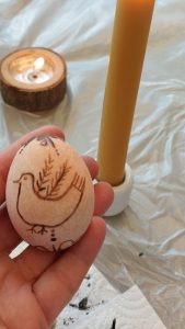 Zusätzlich konnten die TeilnehmerInnen am Workshop auch die „Travlenky“-Technik erlernen, bei der die Muster auf naturfarben braunen Eiern durch Bienenwachs und Essig erzeugt werden.